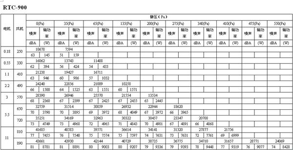 如下面的表格所示,如果选用风量为16273m3/h,静压为30Pa的风机,其转速为600 r/min,声压级为68dB(A),实际耗功率为1112W,选配电机功率为1.5kW。
